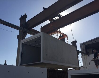Aufhängung mittels 4-strang-Gehänge und Schäkelblehcen zum Bauteil, hier Fertiggarage